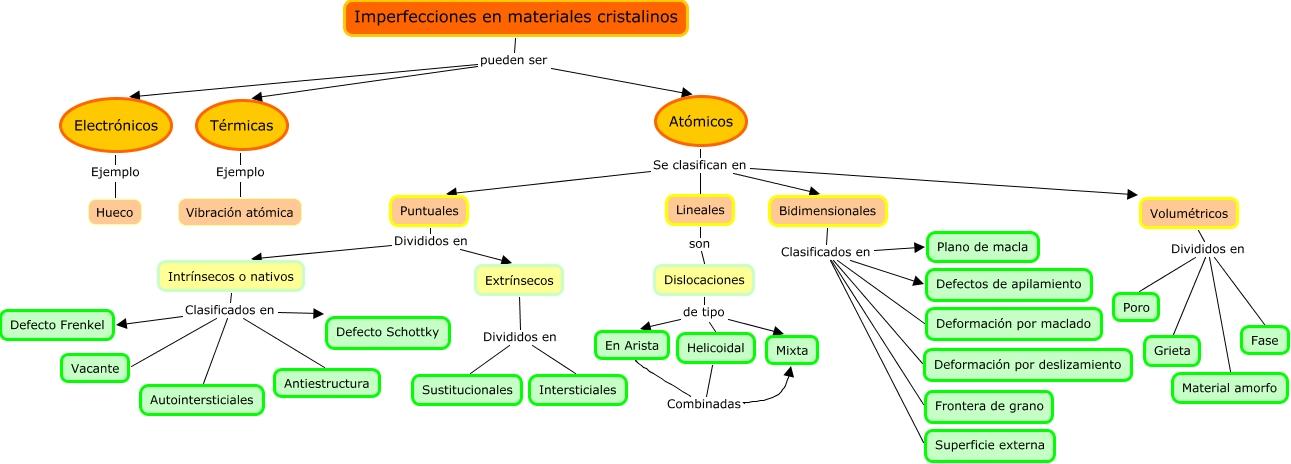 Este Cmap, tiene información relacionada con: Imperfecciones en materiales cristalinosfinal(Esther), Dislocaciones de tipo En Arista, Imperfecciones en materiales cristalinos pueden ser Atómicos, Lineales son Dislocaciones, Bidimensionales Clasificados en Deformación por maclado, Atómicos Se clasifican en Bidimensionales, Extrínsecos Divididos en Sustitucionales, Intrínsecos o nativos Clasificados en Defecto Schottky, Atómicos Se clasifican en Volumétricos, Volumétricos Divididos en Poro, Atómicos Se clasifican en Puntuales, En Arista Combinadas Mixta, Extrínsecos Divididos en Intersticiales, Volumétricos Divididos en Fase, Bidimensionales Clasificados en Defectos de apilamiento, Intrínsecos o nativos Clasificados en Antiestructura, Bidimensionales Clasificados en Superficie externa, Electrónicos Ejemplo Hueco, Dislocaciones de tipo Mixta, Puntuales Divididos en Extrínsecos, Bidimensionales Clasificados en Plano de macla