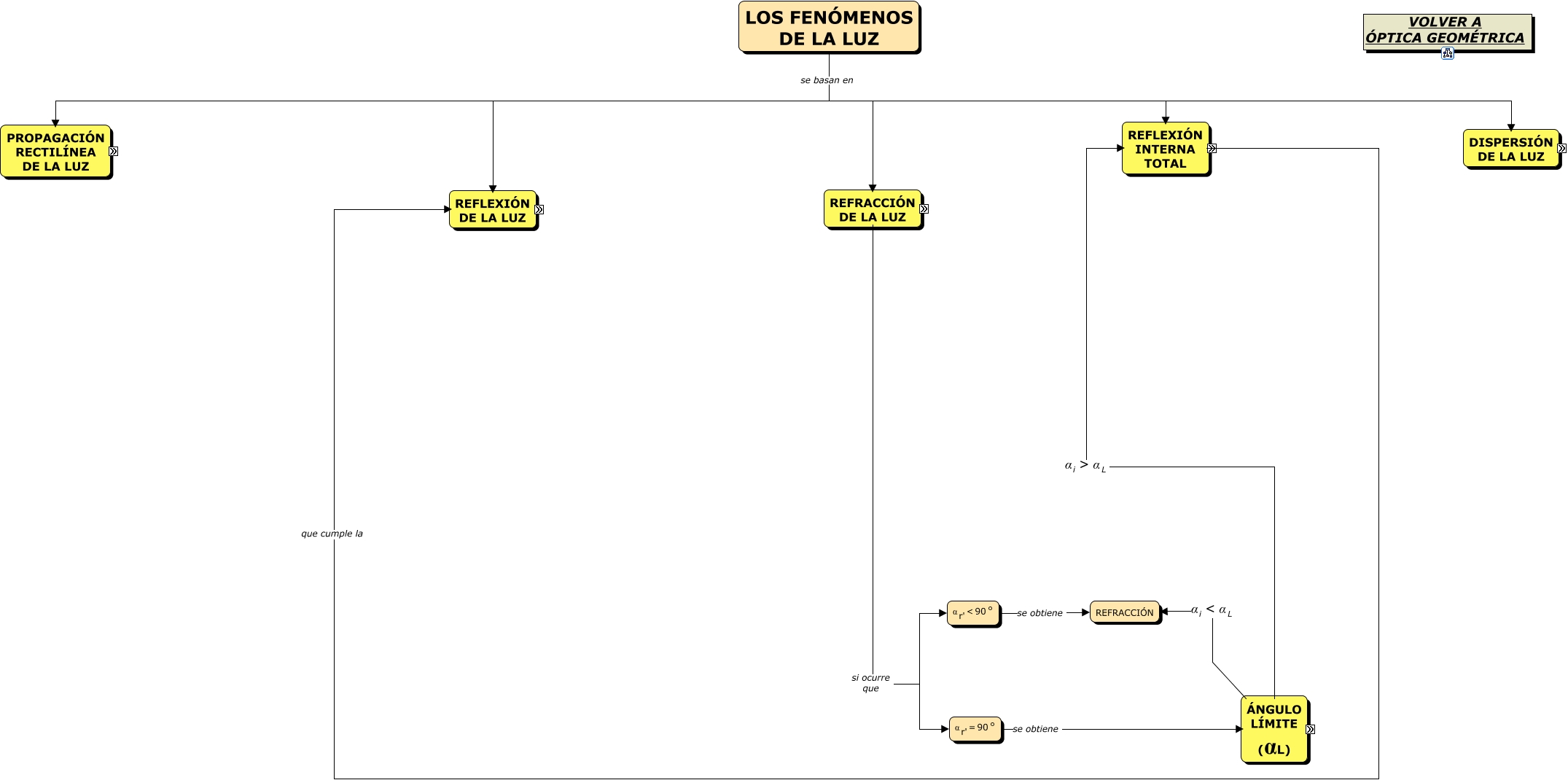Este Cmap, tiene información relacionada con: Fenómenos de la luz - JZB, MAYOR a MENOR, PENUMBRAS donde llega poca LUZ, RAYO PARALELO A LA SUPERFICIE en ese caso <math xmlns="http://www.w3.org/1998/Math/MathML"> <mrow> <mmultiscripts> <mtext> α </mtext> <mtext> i </mtext> <none/> </mmultiscripts> <mtext> ≡ </mtext> <mmultiscripts> <mtext> α </mtext> <mtext> L </mtext> <none/> </mmultiscripts> <mtext> =asen </mtext> <mfenced open="(" close=")"> <mfrac> <mrow> <mmultiscripts> <mtext> n </mtext> <mtext> r' </mtext> <none/> </mmultiscripts> </mrow> <mmultiscripts> <mtext> n </mtext> <mtext> i </mtext> <none/> </mmultiscripts> </mfrac> </mfenced> </mrow> </math>, EN UN MEDIO DIFERENTE es decir con DIFERENTE, REFLEXIÓN DE LA LUZ al cambiar de DIRECCIÓN, MENOR por lo que el rayo SE ALEJA, LAS MOLÉCULAS DEL AIRE dando lugar al COLOR AZUL, COLOR AZUL del CIELO, DISPERSIÓN DE LA LUZ en COLORES, SOMBRAS donde no llega LUZ, EN EL MISMO MEDIO como ocurre en los ESPEJOS, COLOR BLANCO de las NUBES, NORMAL es decir <math xmlns="http://www.w3.org/1998/Math/MathML"> <mrow> <mmultiscripts> <mtext> α </mtext> <mtext> i </mtext> <none/> </mmultiscripts> <mtext> > </mtext> <mmultiscripts> <mtext> α </mtext> <mtext> r' </mtext> <none/> </mmultiscripts> </mrow> </math>, PART�CULAS MUY PEQUEÑAS como LAS MOLÉCULAS DEL AIRE, MIE se necesitan PART�CULAS PEQUEÑAS, DIFERENTE valor de �NDICE DE REFRACCIÓN (n), LEY DE LA REFLEXIÓN cuya ecuación es <math xmlns="http://www.w3.org/1998/Math/MathML"> <mrow> <mmultiscripts> <mtext> α </mtext> <mtext> i </mtext> <none/> </mmultiscripts> <mtext> = </mtext> <mmultiscripts> <mtext> α </mtext> <mtext> r </mtext> <none/> </mmultiscripts> </mrow> </math>, REFLEXIÓN DE LA LUZ que explica la VISIÓN, DIRECCIÓN y propagarse EN UN MEDIO DIFERENTE, <math xmlns="http://www.w3.org/1998/Math/MathML"> <mrow> <mmultiscripts> <mtext> α </mtext> <mtext> i </mtext> <none/> </mmultiscripts> <mmultiscripts> <mtext> <α </mtext> <mtext> r' </mtext> <none/> </mmultiscripts> </mrow> </math> si ocurre que <math xmlns="http://www.w3.org/1998/Math/MathML"> <mrow> <mmultiscripts> <mtext> α </mtext> <mtext> r' </mtext> <none/> </mmultiscripts> <mtext> = </mtext> <mmultiscripts> <mtext> 90 </mtext> <none/> <mtext> ∘ </mtext> </mmultiscripts> </mrow> </math>