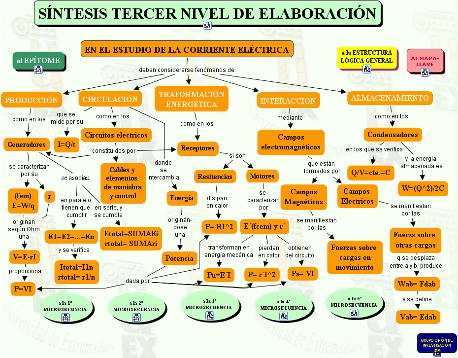 3sintesis, grupo orión de investigación, almacenamiento, p= r´i^2, motores, v=e-ri, interacción, campos electricos, receptores, síntesis tercer nivel de elaboración, i=q t, pu=e´i, al mapa- llave, ps= vi, resitencias, al epítome, q v=cte.=c, generadores, campos magnéticos, etotal=sumaei rtotal= sumari, producción, se asocian, traformación energética, e´(fcem) y r´, en el estudio de la corriente eléctrica, a la 1ª microsecuncia, r, a la 5ª microsecuencia, e1=e2=...=en, a la 3ª microsecuencia , p= ri^2, itotal=i1n rtotal= r1 n, circuitos electricos, wab= fdab, (fem) e=w q, w=(q^2) 2c, campos electromagnéticos, cables y elementos de maniobra y control, vab= edab, potencia, p=vi, fuerzs sobre otras cargas, a la 4ª microsecuencia, condensadores, a la estructura lógica general, circulación, energía, a la 2ª microsecuencia, fuerzas sobre cargas en movimiento