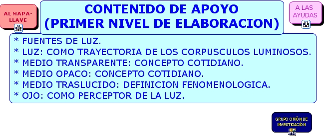 apoyo1, a las ayudas, fuentes de luz. luz como trayectoria de los corpusculos luminosos. medio transparente concepto cotidiano. medio opaco concepto cotidiano. medio traslucido definicion fenomenologica. ojo como perceptor de la luz., contenido de apoyo (primer nivel de elaboracion), grupo orión de investigación, al mapa- llave