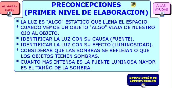 preconcepciones1, al mapa- llave, a las ayudas, la luz es algo estatico que llena el espacio. cuando vemos un objeto algo viaja de nuestro ojo al objeto. identificar la luz con su causa (fuente). identificar la luz con su efecto (luminosidad). considerar que las sombras se reflejan o que los objetos tienen sombras. cuanto mas intensa es la fuente luminosa mayor es el tamño de la sombra., preconcepciones (primer nivel de elaboracion), grupo orión de investigación