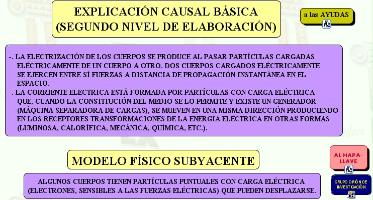 2ecb, explicación causal básica (segundo nivel de elaboración), a las ayudas, -. la electrización de los cuerpos se produce al pasar partículas cargadas eléctricamente de un cuerpo a otro. dos cuerpos cargados eléctricamente se ejercen entre sí fuerzas a distancia de propagación instantánea en el espacio. -. la corriente electrica está formada por partículas con carga eléctrica que, cuando la constitución del medio se lo permite y existe un generador (máquina separadora de cargas), se mueven en una misma dirección produciendo en los receptores transformaciones de la energia eléctrica en otras formas (luminosa, calorífica, mecánica, química, etc.). , modelo físico subyacente, grupo orión de investigación, al mapa- llave, algunos cuerpos tienen partículas puntuales con carga eléctrica (electrones, sensibles a las fuerzas eléctricas) que pueden desplazarse.