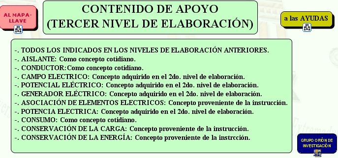 3apoyo, a las ayudas, contenido de apoyo (tercer nivel de elaboración), al mapa- llave, grupo orión de investigación, -. todos los indicados en los niveles de elaboración anteriores. -. aislante como concepto cotidiano. -. conductor como concepto cotidiano. -. campo electrico concepto adquirido en el 2do. nivel de elaboración. -. potencial eléctrico concepto adquirido en el 2do. nivel de elaboración. -. generador eléctrico concepto adquirido en el 2do. nivel de elaboración. -. asociación de elementos electricos concepto proveniente de la instrucción. -. potencia electrica concepto adquirido en el 2do. nivel de elaboración. -. consumo como concepto cotidiano. -. conservación de la carga concepto proveniente de la instrucción. -. conservación de la energía concepto proveniente de la instrcción.