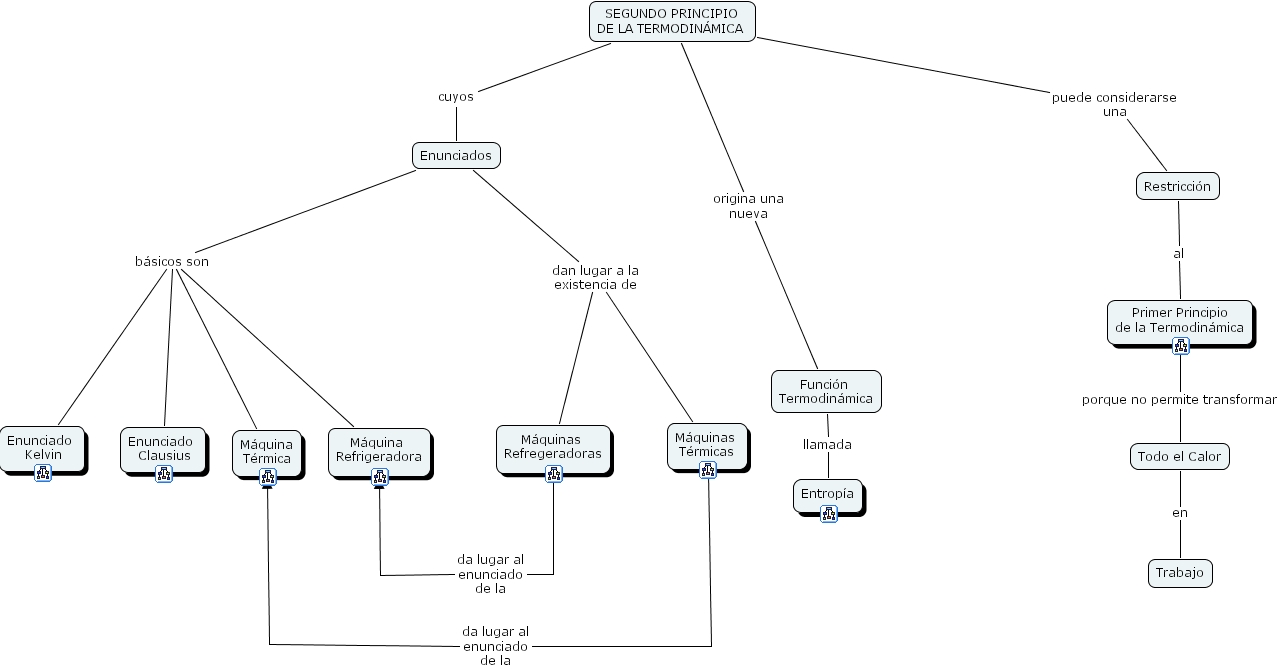 SEGUNDO PRINCIPIO DE LA TERMODINÁMICA cuyos Enunciados, Máquinas Térmicas da lugar al enunciado de la Máquina Térmica, Restricción al Primer Principio de la Termodinámica, Enunciados básicos son Enunciado Clausius, Enunciados básicos son Máquina Térmica, Enunciados básicos son Enunciado Kelvin, Enunciados básicos son Máquina Refrigeradora, Enunciados dan lugar a la existencia de Máquinas Térmicas, Enunciados dan lugar a la existencia de Máquinas Refregeradoras, Máquinas Refregeradoras da lugar al enunciado de la Máquina Refrigeradora, Primer Principio de la Termodinámica porque no permite transformar Todo el Calor, Función Termodinámica llamada Entropía, Todo el Calor en Trabajo, SEGUNDO PRINCIPIO DE LA TERMODINÁMICA puede considerarse una Restricción, SEGUNDO PRINCIPIO DE LA TERMODINÁMICA origina una nueva Función Termodinámica