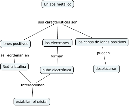 Enlace metálico(PabloMuñoz), las capas de iones positivos pueden desplazarse, iones positivos se reordenan en Red cristalina, Red cristalina Interaccionan estabilan el cristal, nube electrónica Interaccionan estabilan el cristal, los electrones forman nube electrónica, Enlace metálico sus caracteristicas son las capas de iones positivos, Enlace metálico sus caracteristicas son iones positivos, Enlace metálico sus caracteristicas son los electrones