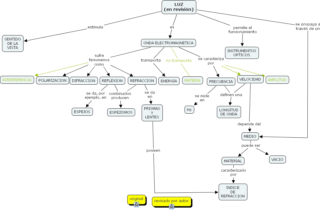 FRECUENCIA se mide en Hz, REFLEXION combinados producen ESPEJISMOS, ONDA ELECTROMAGNETICA se caracteriza por FRECUENCIA, ONDA ELECTROMAGNETICA se caracteriza por AMPLITUD, ONDA ELECTROMAGNETICA se caracteriza por VELOCIDAD, PRISMAS Y LENTES poseen INDICE DE REFRACCION, LUZ (en revisión) estimula SENTIDO DE LA VISTA, LUZ (en revisión) permite el funcionamiento INSTRUMENTOS OPTICOS, REFLEXION se da, por ejemplo, en ESPEJOS, VELOCIDAD depende del MEDIO, MATERIAL caracterizado por INDICE DE REFRACCION, ONDA ELECTROMAGNETICA sufre fenomenos como POLARIZACION, ONDA ELECTROMAGNETICA sufre fenomenos como DIFRACCION, ONDA ELECTROMAGNETICA sufre fenomenos como REFRACCION, ONDA ELECTROMAGNETICA sufre fenomenos como REFLEXION, ONDA ELECTROMAGNETICA sufre fenomenos como INTERFERENCIA, LUZ (en revisión) es ONDA ELECTROMAGNETICA, REFRACCION combinados producen ESPEJISMOS, REFRACCION se da en PRISMAS Y LENTES, LUZ (en revisión) se propaga a través de un MEDIO, MEDIO puede ser MATERIAL, MEDIO puede ser VACIO, ONDA ELECTROMAGNETICA no transporta MATERIA, ONDA ELECTROMAGNETICA transporta ENERGIA, FRECUENCIA definen una LONGITUD DE ONDA, FRECUENCIA definen una VELOCIDAD