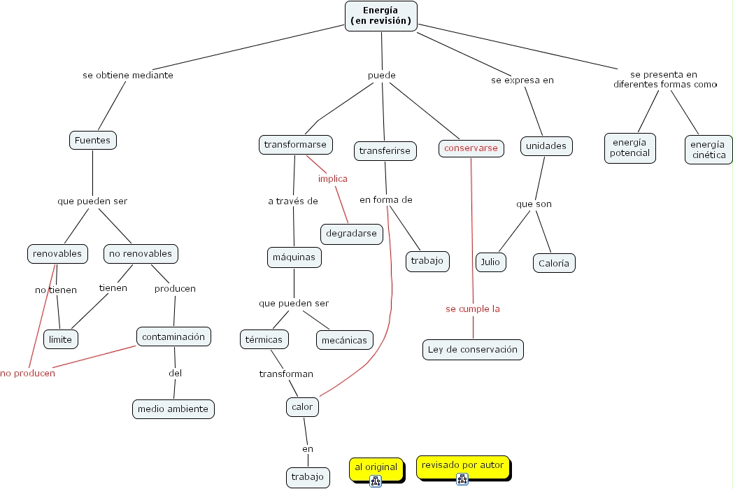 transferirse en forma de trabajo, transferirse en forma de calor, unidades que son Caloría, unidades que son Julio, Energía (en revisión) se expresa en unidades, Energía (en revisión) se obtiene mediante Fuentes, Fuentes que pueden ser no renovables, Fuentes que pueden ser renovables, transformarse implica degradarse, renovables no producen contaminación, térmicas transforman calor, no renovables producen contaminación, contaminación del medio ambiente, conservarse se cumple la Ley de conservación, calor en trabajo, Energía (en revisión) se presenta en diferentes formas como energía potencial, Energía (en revisión) se presenta en diferentes formas como energía cinética, no renovables tienen límite, máquinas que pueden ser térmicas, máquinas que pueden ser mecánicas, transformarse a través de máquinas, renovables no tienen límite, Energía (en revisión) puede transformarse, Energía (en revisión) puede transferirse, Energía (en revisión) puede conservarse