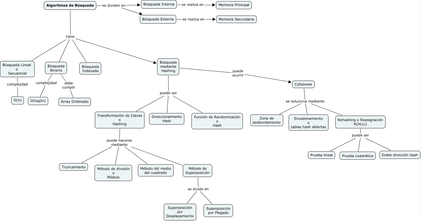 Algoritmos de Búsqueda, Búsqueda mediante Hashing puede ser Función de Randomización o Hash, Algoritmos de Búsqueda tipos Búsqueda Lineal o Secuencial, Transformación de Claves o Hashing puede hacerse mediante Método del medio del cuadrado, Método de Superposición se divide en Superposición por Plegado, Búsqueda Binaria complejidad O(log2n), Búsqueda Lineal o Secuencial complejidad O(n), Búsqueda Interna se realiza en Memoria Principal, Transformación de Claves o Hashing puede hacerse mediante Método de Superposición, Transformación de Claves o Hashing puede hacerse mediante Método de división o Módulo, Búsqueda mediante Hashing puede ocurrir Colisiones