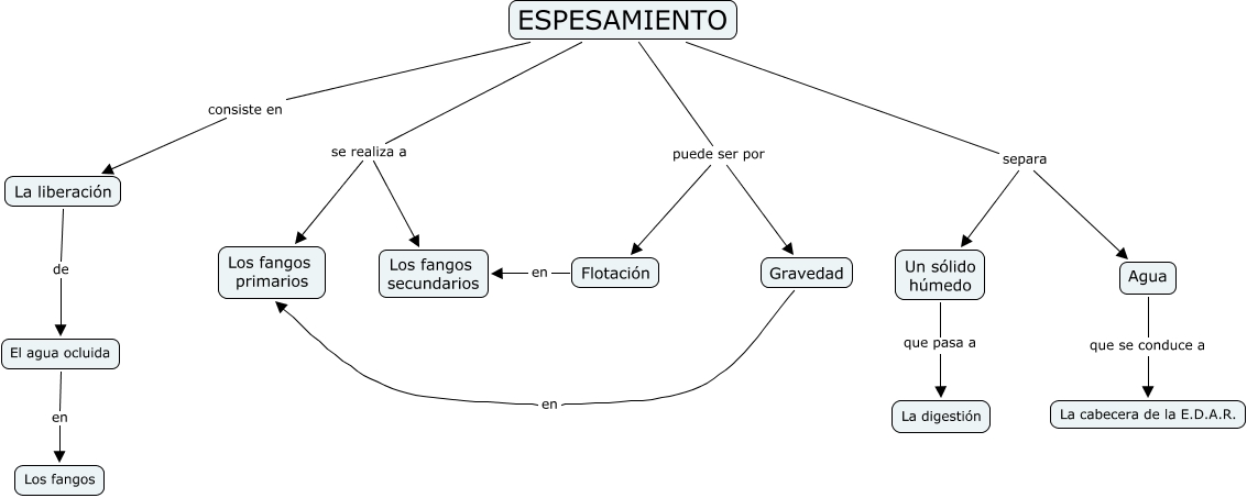 esesamiento, ESPESAMIENTO se realiza a Los fangos primarios, ESPESAMIENTO puede ser por Flotación, ESPESAMIENTO se realiza a Los fangos secundarios, Flotación en Los fangos secundarios, Gravedad en Los fangos primarios, ESPESAMIENTO separa Agua, ESPESAMIENTO consiste en La liberación, Agua que se conduce a La cabecera de la E.D.A.R., La liberación de El agua ocluida, Un sólido húmedo que pasa a La digestión