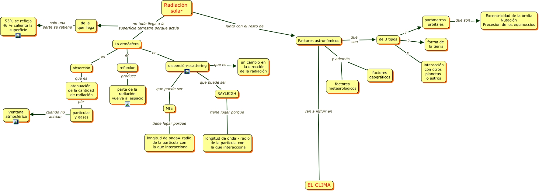 Este mapa conceptual tiene información relacionada a: radiación solar, atenuación de la cantidad de radiación por partÃculas y gases, La atmósfera en dispersión-scattering, reflexión produce parte de la radiación vuelva al espacio, partÃculas y gases cuando no actúan Ventana atmosférica, MIE tiene lugar porque longitud de onda= radio de la partÃcula con la que interacciona, parámetros orbitales que son Excentricidad de la órbita Nutación Precesión de los equinoccios, RAYLEIGH tiene lugar porque longitud de onda> radio de la partÃcula con la que interacciona, Factores astronómicos van a influir en EL CLIMA, absorción que es atenuación de la cantidad de radiación, Radiación solar junto con el resto de Factores astronómicos