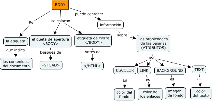 Este Cmap, tiene información relacionada con: 5-Etiqueta body, LINK es color de los enlaces, BGCOLOR Es color del fondo, BODY Es la etiqueta, etiqueta de cierre </BODY> Antes de </HTML>, BACKGROUND es imagen de fondo, las propiedades de las páginas (ATRIBUTOS) son BGCOLOR, las propiedades de las páginas (ATRIBUTOS) son BACKGROUND, BODY se colocan etiqueta de cierre </BODY>, TEXT es color del texto, información sobre las propiedades de las páginas (ATRIBUTOS), BODY se colocan etiqueta de apertura <BODY>, la etiqueta que indica los contenidos del documento, las propiedades de las páginas (ATRIBUTOS) son LINK, BODY puede contener información, las propiedades de las páginas (ATRIBUTOS) son TEXT, etiqueta de apertura <BODY> Después de </HEAD>