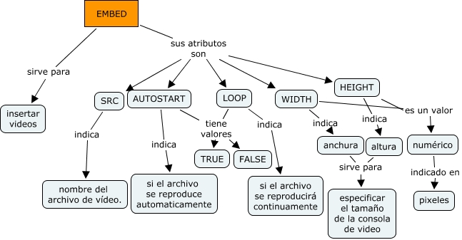 Este Cmap, tiene información relacionada con: 11-etiqueta embed, LOOP tiene valores TRUE, EMBED sirve para insertar videos, AUTOSTART tiene valores TRUE, EMBED sus atributos son SRC, EMBED sus atributos son WIDTH, WIDTH indica anchura, EMBED sus atributos son AUTOSTART, LOOP tiene valores FALSE, anchura sirve para especificar el tamaño de la consola de video, SRC indica nombre del archivo de vídeo., altura sirve para especificar el tamaño de la consola de video, AUTOSTART tiene valores FALSE, EMBED sus atributos son HEIGHT, HEIGHT es un valor numérico, AUTOSTART indica si el archivo se reproduce automaticamente, EMBED sus atributos son LOOP, WIDTH es un valor numérico, numérico indicado en pixeles, LOOP indica si el archivo se reproducirá continuamente, HEIGHT indica altura