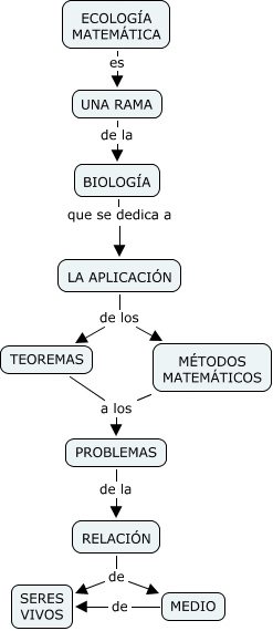 ECOLOG�A MATEM�TICA, RELACIÓN de MEDIO, ECOLOG�A MATEM�TICA es UNA RAMA, MÉTODOS MATEM�TICOS a los PROBLEMAS, PROBLEMAS de la RELACIÓN, MEDIO de SERES VIVOS, RELACIÓN de SERES VIVOS, LA APLICACIÓN de los MÉTODOS MATEM�TICOS, UNA RAMA de la BIOLOG�A, LA APLICACIÓN de los TEOREMAS, BIOLOG�A que se dedica a LA APLICACIÓN