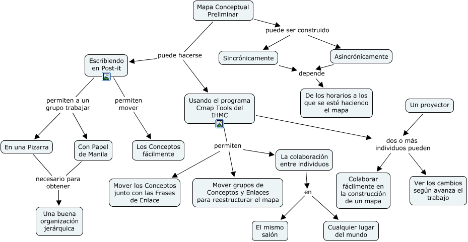 MCPreliminar, Asincrónicamente depende De los horarios a los que se esté haciendo el mapa, Usando el programa Cmap Tools del IHMC dos o más individuos pueden Colaborar fácilmente en la construcción de un mapa, Sincrónicamente depende De los horarios a los que se esté haciendo el mapa, Un proyector dos o más individuos pueden Ver los cambios según avanza el trabajo, En una Pizarra necesario para obtener Una buena organización jerárquica, Usando el programa Cmap Tools del IHMC permiten Mover los Conceptos junto con las Frases de Enlace, Mapa Conceptual Preliminar puede hacerse Usando el programa Cmap Tools del IHMC, Escribiendo en Post-it permiten a un grupo trabajar Con Papel de Manila, Con Papel de Manila necesario para obtener Una buena organización jerárquica, Usando el programa Cmap Tools del IHMC permiten La colaboración entre individuos