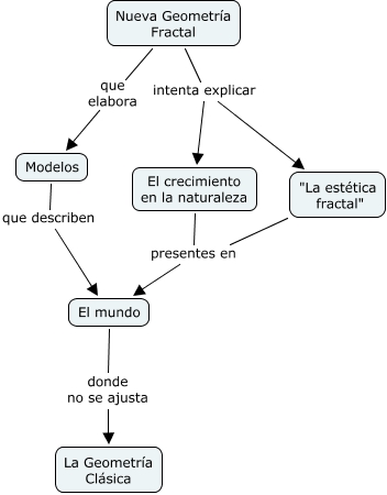 Este Cmap, tiene información relacionada con: Nueva_Geometría, Modelos que describen El mundo, "La estética fractal" presentes en El mundo, Nueva Geometría Fractal intenta explicar El crecimiento en la naturaleza, Nueva Geometría Fractal que elabora Modelos, El crecimiento en la naturaleza presentes en El mundo, El mundo donde no se ajusta La Geometría Clásica, Nueva Geometría Fractal intenta explicar "La estética fractal"