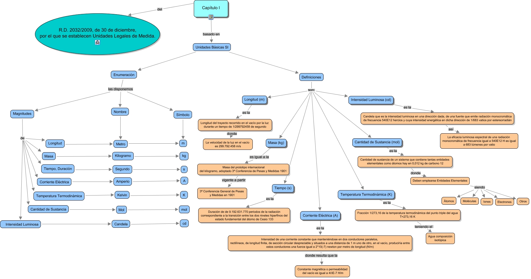 Este Cmap, tiene información relacionada con: CapÃtulo I, Tiempo, Duración ???? Segundo, CapÃtulo I del R.D. 2032/2009, de 30 de diciembre, por el que se establecen Unidades Legales de Medida., Intensidad Luminosa (cd) es la Candela que es la intensidad luminosa en una dirección dada, de una fuente que emite radiación monocromática de frecuencia 540E12 hercios y cuya intensidad energética en dicha dirección de 1/683 vatios por estereorradián, Candela ???? cd, Definiciones son: Corriente Eléctrica (A), Kilogramo ???? kg, Corriente Eléctrica ???? Amperio, Longitud del trayecto recorrido en el vacÃo por la luz durante un tiempo de 1/299792458 de segundo donde La velocidad de la luz en el vacÃo es 299.792.458 m/s, Temperatura Termodinámica ???? Kelvin, Deben emplearse Entidades Elementales siendo Moléculas, Deben emplearse Entidades Elementales siendo Ã?tomos, Unidades Básicas SI ???? Enumeración, Enumeración las disponemos Nombre, Segundo ???? s, Masa (kg) es igual a la Masa del prototipo internacional del kilogramo, adoptado 3ª Conferencia de Pesas y Medidas 1901, Unidades Básicas SI ???? Definiciones, Magnitudes de Corriente Eléctrica, Magnitudes de Masa, Cantidad de Sustancia ???? Mol, Temperatura Termodinámica (K) es la Fracción 1/273,16 de la temperatura termodinámica del punto triple del agua T=273,16 K