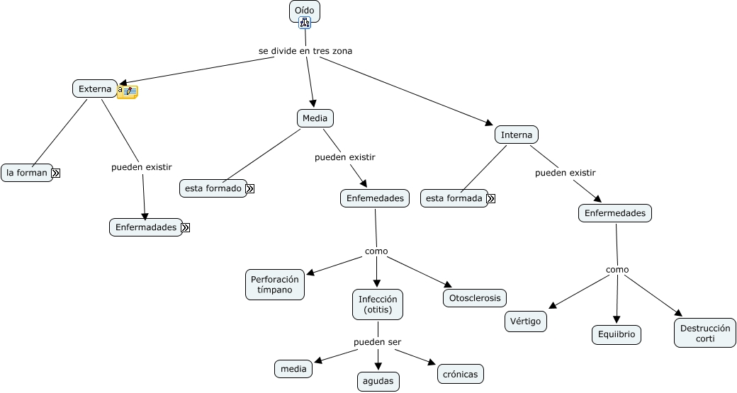 Este Cmap, tiene información relacionada con: Oido, Enfermedades como Equiibrio, Enfermedades como Canales Semicircuares, Enfermedades como Vértigo, Interna esta formado por cóclea ósea, Infección (otitis) pueden ser media, Enfermedades como cóclea membranosa, Enfermedades como Destrucción corti, Enfemedades como Perforación tímpano, Externa pueden existir Enfermedades, pelos son las encargadas gándulas, Infección (otitis) pueden ser agudas, Media pueden existir Enfemedades, Externa la forman Pabellón auditivo, Externa la forman Conducto auditivo externo, Media esta formado trompa de Eustaquio, pelos son las encargadas segragación de la cera, Enfermedades como cóclea ósea, Oído se divide en tres zona Interna, Enfemedades como Infección (otitis), Interna esta formado por cóclea membranosa