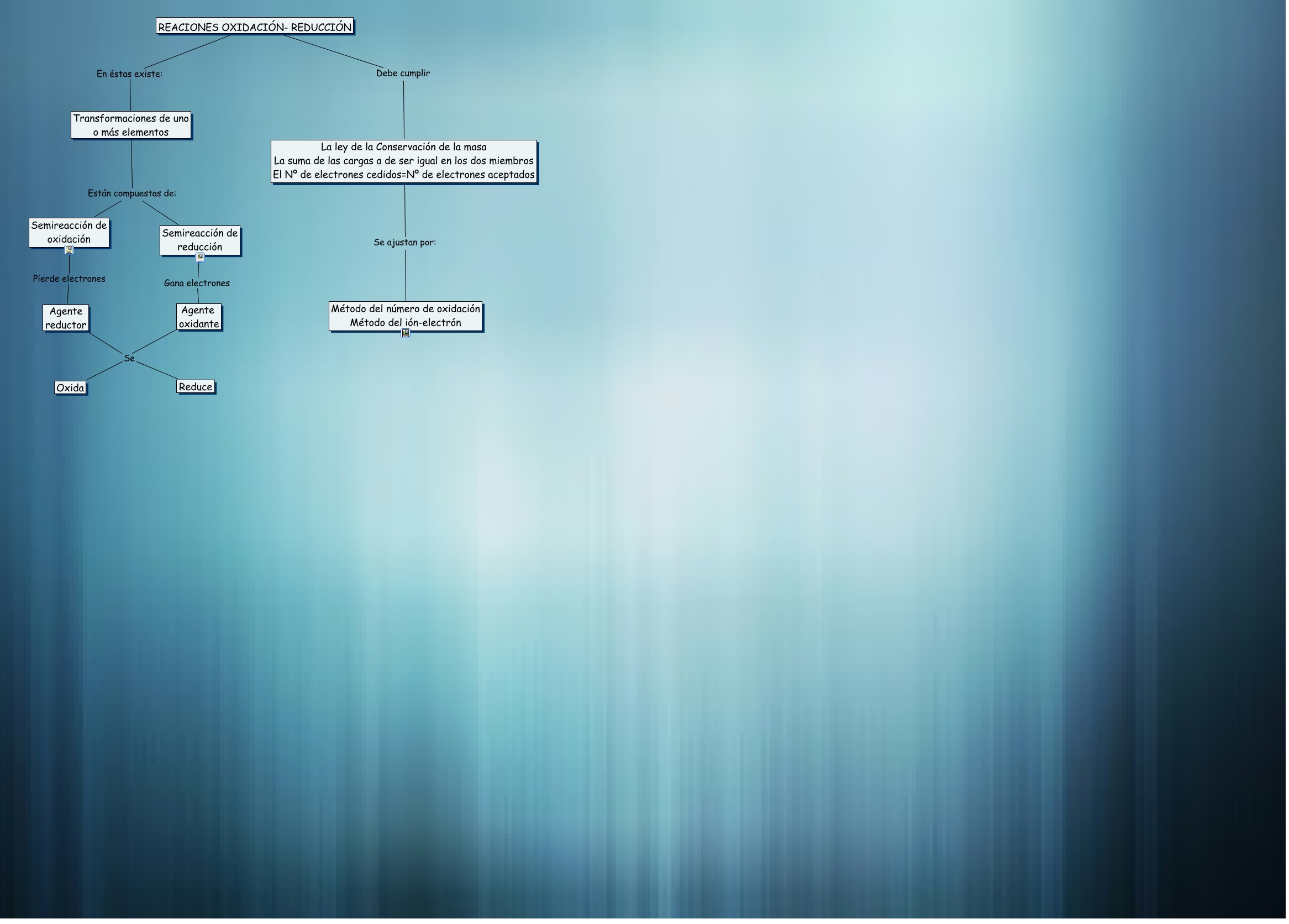 Este Cmap, tiene información relacionada con: REACCIONES REDOX(Vanessa), Transformaciones de uno o más elementos Están compuestas de: Semireacción de reducción, Transformaciones de uno o más elementos Están compuestas de: Semireacción de oxidación, Agente oxidante Se Reduce, REACIONES OXIDACIÓN- REDUCCIÓN Debe cumplir La ley de la Conservación de la masa La suma de las cargas a de ser igual en los dos miembros El Nº de electrones cedidos=Nº de electrones aceptados, La ley de la Conservación de la masa La suma de las cargas a de ser igual en los dos miembros El Nº de electrones cedidos=Nº de electrones aceptados Se ajustan por: Método del número de oxidación Método del ión-electrón, Semireacción de oxidación Pierde electrones Agente reductor, Agente reductor Se Reduce, REACIONES OXIDACIÓN- REDUCCIÓN En éstas existe: Transformaciones de uno o más elementos, Semireacción de reducción Gana electrones Agente oxidante, Agente oxidante Se Oxida, Agente reductor Se Oxida