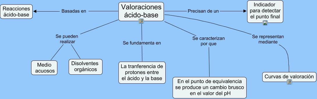Este Cmap, tiene información relacionada con: Curvas de valoracion, Valoraciones ácido-base Se representan mediante Curvas de valoración, Valoraciones ácido-base Se pueden realizar Disolventes orgánicos, Valoraciones ácido-base Se caracterizan por que En el punto de equivalencia se produce un cambio brusco en el valor del pH, Valoraciones ácido-base Se fundamenta en La tranferencia de protones entre el ácido y la base, Valoraciones ácido-base Basadas en Reacciones ácido-base, Valoraciones ácido-base Se pueden realizar Medio acuosos, Valoraciones ácido-base Precisan de un Indicador para detectar el punto final