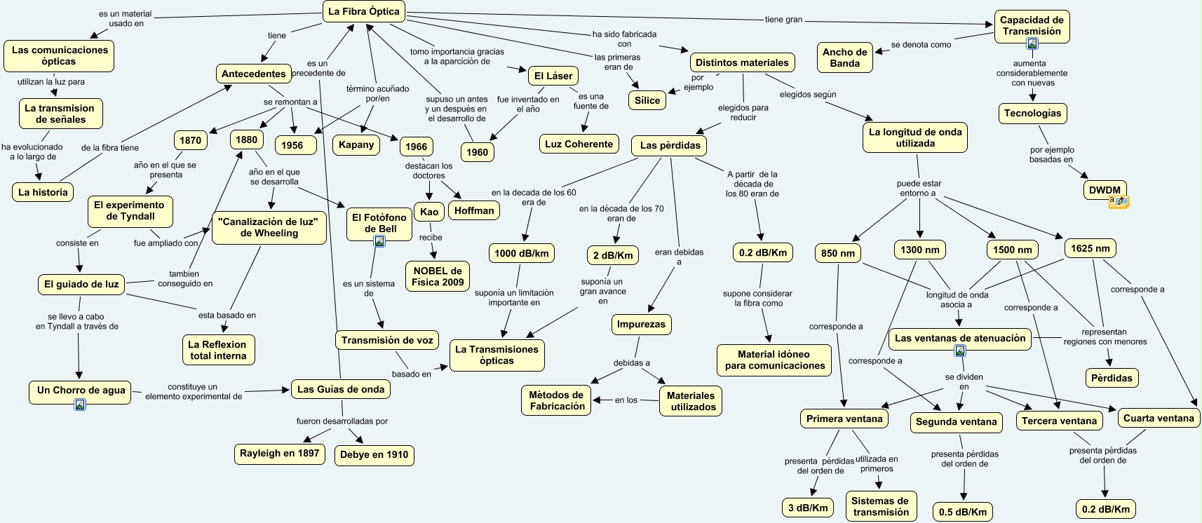 Este Cmap, tiene información relacionada con: Introduccion A la Fibra Optica, 1966 destacan los doctores Kao, La Fibra Óptica término acuñado por/en Kapany, 1880 año en el que se desarrolla El Fotófono de Bell, Las pérdidas eran debidas a Impurezas, La Fibra Óptica tomo importancia gracias a la aparcición de El Láser, Las Guías de onda fueron desarrolladas por Rayleigh en 1897, El guiado de luz esta basado en La Reflexion total interna, Las pérdidas A partir de la década de los 80 eran de 0.2 dB/Km, La historia de la fibra tiene Antecedentes, El experimento de Tyndall consiste en El guiado de luz, La Fibra Óptica es un material usado en Las comunicaciones ópticas, Capacidad de Transmisión aumenta considerablemente con nuevas Tecnologías, El Láser es una fuente de Luz Coherente, 2 dB/Km suponía un gran avance en La Transmisiones ópticas, La longitud de onda utilizada puede estar entorno a 1500 nm, 1625 nm corresponde a Cuarta ventana, La transmision de señales ha evolucionado a lo largo de La historia, Las ventanas de atenuación se dividen en Primera ventana, Impurezas debidas a Métodos de Fabricación, La longitud de onda utilizada puede estar entorno a 1625 nm