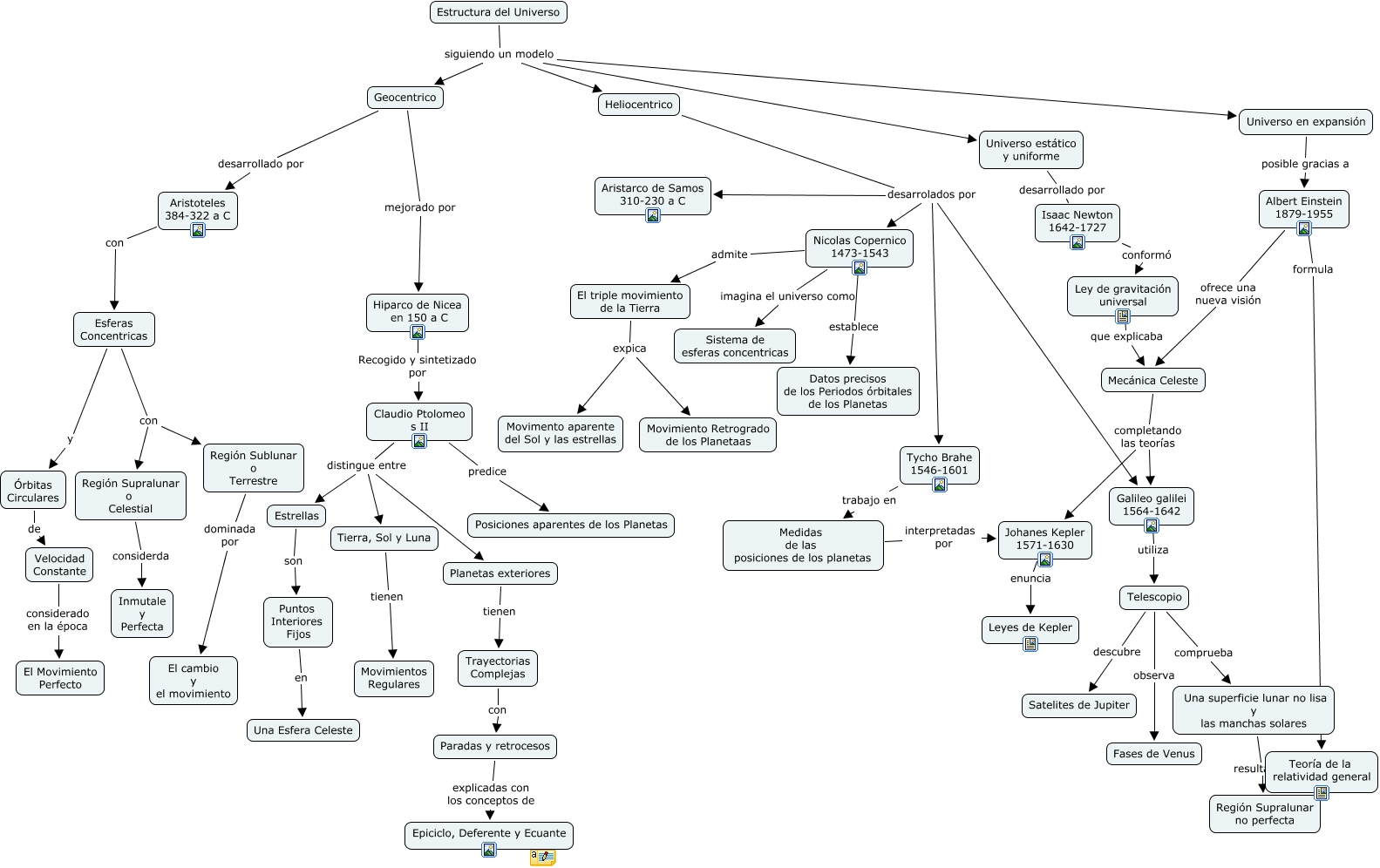 Este Cmap, tiene información relacionada con: Modelos.cmap, Mecánica Celeste completando las teorías Johanes Kepler 1571-1630, Nicolas Copernico 1473-1543 imagina el universo como Sistema de esferas concentricas, Esferas Concentricas con Región Sublunar o Terrestre, Geocentrico desarrollado por Aristoteles 384-322 a C, Planetas exteriores tienen Trayectorias Complejas, Galileo galilei 1564-1642 utiliza Telescopio, Paradas y retrocesos explicadas con los conceptos de Epiciclo, Deferente y Ecuante, Telescopio comprueba Una superficie lunar no lisa y las manchas solares, Heliocentrico desarrolados por Galileo galilei 1564-1642, Tierra, Sol y Luna tienen Movimientos Regulares, Estructura del Universo siguiendo un modelo Geocentrico, Geocentrico mejorado por Hiparco de Nicea en 150 a C, Universo en expansión posible gracias a Albert Einstein 1879-1955, Aristoteles 384-322 a C con Esferas Concentricas, Trayectorias Complejas con Paradas y retrocesos, Claudio Ptolomeo s II distingue entre Estrellas, Estrellas son Puntos Interiores Fijos, Ley de gravitación universal que explicaba Mecánica Celeste, Medidas de las posiciones de los planetas interpretadas por Johanes Kepler 1571-1630, Puntos Interiores Fijos en Una Esfera Celeste