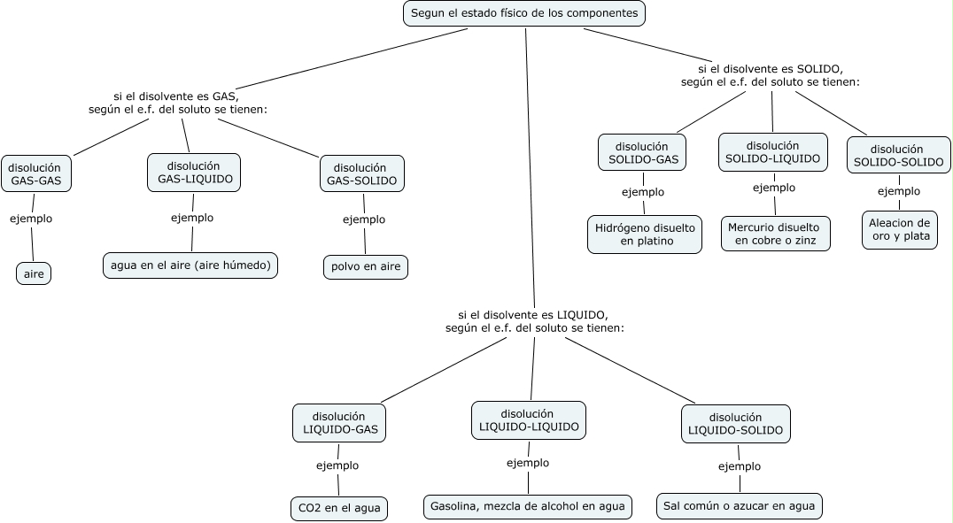 Este Cmap, tiene información relacionada con: ANEXO a MAPA INICIAL clasificacion disluciones REBECA, disolución SOLIDO-SOLIDO ejemplo Aleacion de oro y plata, disolución LIQUIDO-SOLIDO ejemplo Sal común o azucar en agua, Segun el estado físico de los componentes si el disolvente es GAS, según el e.f. del soluto se tienen: disolución GAS-LIQUIDO, disolución SOLIDO-GAS ejemplo Hidrógeno disuelto en platino, Segun el estado físico de los componentes si el disolvente es GAS, según el e.f. del soluto se tienen: disolución GAS-SOLIDO, disolución GAS-SOLIDO ejemplo polvo en aire, disolución GAS-LIQUIDO ejemplo agua en el aire (aire húmedo), Segun el estado físico de los componentes si el disolvente es SOLIDO, según el e.f. del soluto se tienen: disolución SOLIDO-LIQUIDO, disolución LIQUIDO-GAS ejemplo CO2 en el agua, disolución LIQUIDO-LIQUIDO ejemplo Gasolina, mezcla de alcohol en agua, Segun el estado físico de los componentes si el disolvente es LIQUIDO, según el e.f. del soluto se tienen: disolución LIQUIDO-LIQUIDO, Segun el estado físico de los componentes si el disolvente es SOLIDO, según el e.f. del soluto se tienen: disolución SOLIDO-GAS, Segun el estado físico de los componentes si el disolvente es SOLIDO, según el e.f. del soluto se tienen: disolución SOLIDO-SOLIDO, Segun el estado físico de los componentes si el disolvente es LIQUIDO, según el e.f. del soluto se tienen: disolución LIQUIDO-SOLIDO, disolución GAS-GAS ejemplo aire, Segun el estado físico de los componentes si el disolvente es LIQUIDO, según el e.f. del soluto se tienen: disolución LIQUIDO-GAS, disolución SOLIDO-LIQUIDO ejemplo Mercurio disuelto en cobre o zinz, Segun el estado físico de los componentes si el disolvente es GAS, según el e.f. del soluto se tienen: disolución GAS-GAS