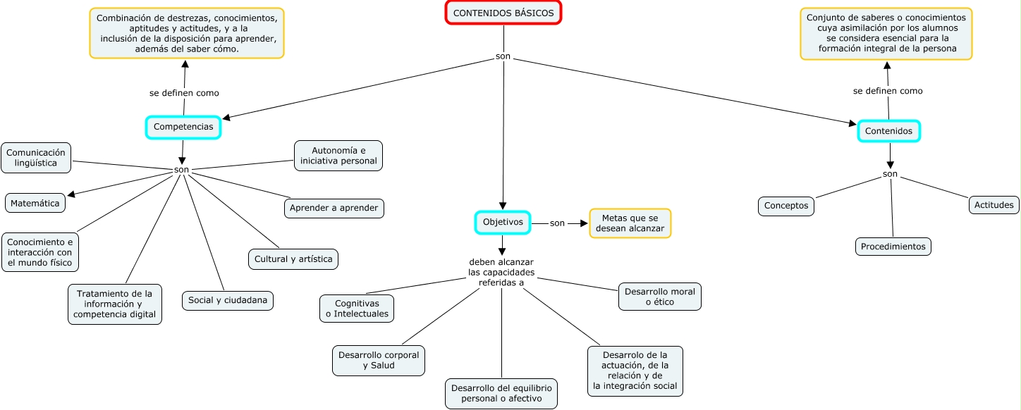 Este Cmap, tiene información relacionada con: Contenidos Básicos, Competencias son Cultural y artÃstica, Competencias son Tratamiento de la información y competencia digital, Contenidos son Procedimientos, Competencias son Matemática, Competencias se definen como Combinación de destrezas, conocimientos, aptitudes y actitudes, y a la inclusión de la disposición para aprender, además del saber cómo., Contenidos se definen como Conjunto de saberes o conocimientos cuya asimilación por los alumnos se considera esencial para la formación integral de la persona, Objetivos deben alcanzar las capacidades referidas a Cognitivas o Intelectuales, Competencias son Conocimiento e interacción con el mundo fÃsico, CONTENIDOS BÃ?SICOS son Contenidos, Objetivos deben alcanzar las capacidades referidas a Desarrolo de la actuación, de la relación y de la integración social, Objetivos deben alcanzar las capacidades referidas a Desarrollo del equilibrio personal o afectivo, Contenidos son Conceptos, Competencias son Aprender a aprender, Competencias son AutonomÃa e iniciativa personal, Competencias son Comunicación lingüÃstica, Objetivos deben alcanzar las capacidades referidas a Desarrollo corporal y Salud, Objetivos son Metas que se desean alcanzar, Objetivos deben alcanzar las capacidades referidas a Desarrollo moral o ético, Contenidos son Actitudes, CONTENIDOS BÃ?SICOS son Competencias