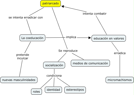 Este Cmap, tiene información relacionada con: Patriarcado, patriarcado Se reproduce medios de comunicación, socialización condiciona identidad, socialización condiciona estereotipos, La coeducación implica educación en valores, patriarcado Se reproduce socialización, educación en valores intenta combatir patriarcado, socialización condiciona roles, educación en valores erradica micromachismos, patriarcado se intenta erradicar con La coeducación, La coeducación pretende inculcar nuevas masculinidades