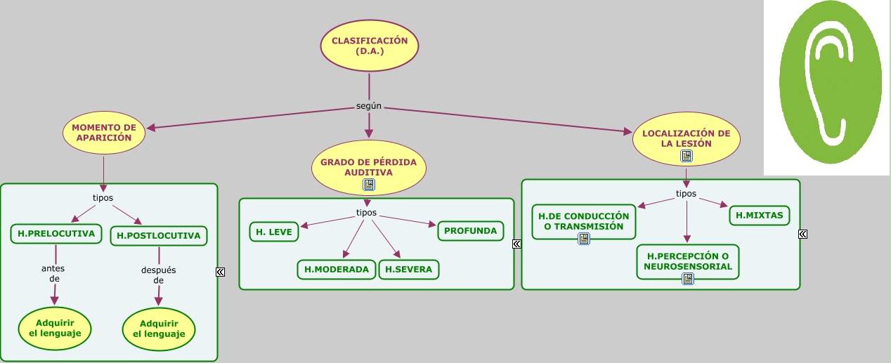 Este Cmap, tiene información relacionada con: CLASIFICACIÓN DE LA D.A, CLASIFICACIÓN (D.A.) según LOCALIZACIÓN DE LA LESIÓN, MOMENTO DE APARICIÓN tipos H.PRELOCUTIVA, GRADO DE PÉRDIDA AUDITIVA tipos H.MODERADA, GRADO DE PÉRDIDA AUDITIVA tipos PROFUNDA, H.POSTLOCUTIVA después de Adquirir el lenguaje, LOCALIZACIÓN DE LA LESIÓN tipos H.PERCEPCIÓN O NEUROSENSORIAL, LOCALIZACIÓN DE LA LESIÓN tipos H.MIXTAS, CLASIFICACIÓN (D.A.) según MOMENTO DE APARICIÓN, GRADO DE PÉRDIDA AUDITIVA tipos H.SEVERA, LOCALIZACIÓN DE LA LESIÓN tipos H.DE CONDUCCIÓN O TRANSMISIÓN, CLASIFICACIÓN (D.A.) según GRADO DE PÉRDIDA AUDITIVA, H.PRELOCUTIVA antes de Adquirir el lenguaje, MOMENTO DE APARICIÓN tipos H.POSTLOCUTIVA, GRADO DE PÉRDIDA AUDITIVA tipos H. LEVE