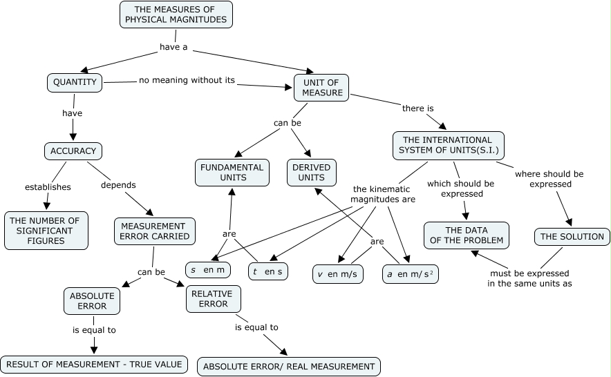 Este Cmap, tiene información relacionada con: InglesUnidades de Medida, THE SOLUTION must be expressed in the same units as THE DATA OF THE PROBLEM, MEASUREMENT ERROR CARRIED can be RELATIVE ERROR, THE MEASURES OF PHYSICAL MAGNITUDES have a UNIT OF MEASURE, THE INTERNATIONAL SYSTEM OF UNITS(S.I.) the kinematic magnitudes are <math xmlns="http://www.w3.org/1998/Math/MathML"> <mrow> <mtext> a en m/ </mtext> <mmultiscripts> <mtext> s </mtext> <none/> <mtext> 2 </mtext> </mmultiscripts> </mrow> </math>, QUANTITY no meaning without its UNIT OF MEASURE, MEASUREMENT ERROR CARRIED can be ABSOLUTE ERROR, THE MEASURES OF PHYSICAL MAGNITUDES have a QUANTITY, UNIT OF MEASURE can be DERIVED UNITS, QUANTITY have ACCURACY, THE INTERNATIONAL SYSTEM OF UNITS(S.I.) the kinematic magnitudes are s en m, s en m are FUNDAMENTAL UNITS, THE INTERNATIONAL SYSTEM OF UNITS(S.I.) which should be expressed THE DATA OF THE PROBLEM, THE INTERNATIONAL SYSTEM OF UNITS(S.I.) where should be expressed THE SOLUTION, UNIT OF MEASURE there is THE INTERNATIONAL SYSTEM OF UNITS(S.I.), v en m/s are DERIVED UNITS, ACCURACY depends MEASUREMENT ERROR CARRIED, ACCURACY establishes THE NUMBER OF SIGNIFICANT FIGURES, t en s are FUNDAMENTAL UNITS, THE INTERNATIONAL SYSTEM OF UNITS(S.I.) the kinematic magnitudes are t en s, ABSOLUTE ERROR is equal to RESULT OF MEASUREMENT - TRUE VALUE