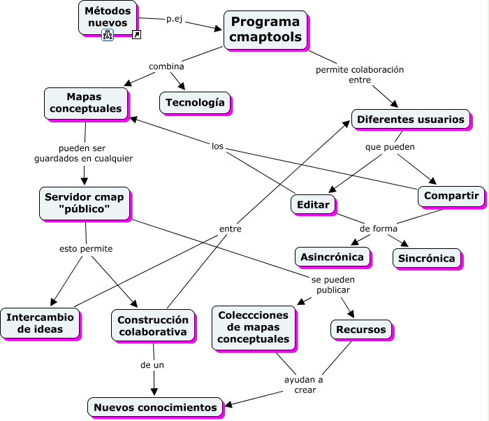 Este Cmap, tiene información relacionada con: Cristina-programa cmaptools, Construcción colaborativa entre Diferentes usuarios, Compartir los Mapas conceptuales, Recursos ayudan a crear Nuevos conocimientos, Coleccciones de mapas conceptuales ayudan a crear Nuevos conocimientos, Servidor cmap "público" se pueden publicar Recursos, Servidor cmap "público" esto permite Construcción colaborativa, Construcción colaborativa de un Nuevos conocimientos, Editar los Mapas conceptuales, Servidor cmap "público" esto permite Intercambio de ideas, Programa cmaptools permite colaboración entre Diferentes usuarios, Servidor cmap "público" se pueden publicar Coleccciones de mapas conceptuales, Editar de forma Sincrónica, Diferentes usuarios que pueden Editar, Diferentes usuarios que pueden Compartir, Intercambio de ideas entre Diferentes usuarios, Métodos nuevos p.ej Programa cmaptools, Editar de forma Asincrónica, Programa cmaptools combina Tecnología, Mapas conceptuales pueden ser guardados en cualquier Servidor cmap "público", Programa cmaptools combina Mapas conceptuales