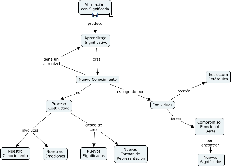 Este Cmap, tiene información relacionada con: aprendizaje significativo, Afirmación con Significado produce Aprendizaje Significativo, Proceso Costructivo deseo de crear Nuevos Significados, Individuos poseén Estructura Jerárquica, Compromiso Emocional Fuerte por encontrar Nuevos Significados, Individuos tienen Compromiso Emocional Fuerte, Aprendizaje Significativo crea Nuevo Conocimiento, Nuevo Conocimiento es Proceso Costructivo, Proceso Costructivo involucra Nuestras Emociones, Proceso Costructivo involucra Nuestro Conocimiento, Nuevo Conocimiento tiene un alto nivel Aprendizaje Significativo, Nuevo Conocimiento es logrado por Individuos, Proceso Costructivo deseo de crear Nuevas Formas de Representación