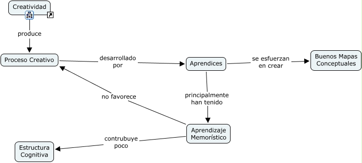 Este Cmap, tiene información relacionada con: proceso creativo, Aprendizaje Memorístico no favorece Proceso Creativo, Aprendizaje Memorístico contrubuye poco Estructura Cognitiva, Aprendices principalmente han tenido Aprendizaje Memorístico, Aprendices se esfuerzan en crear Buenos Mapas Conceptuales, Proceso Creativo desarrollado por Aprendices, Creatividad produce Proceso Creativo