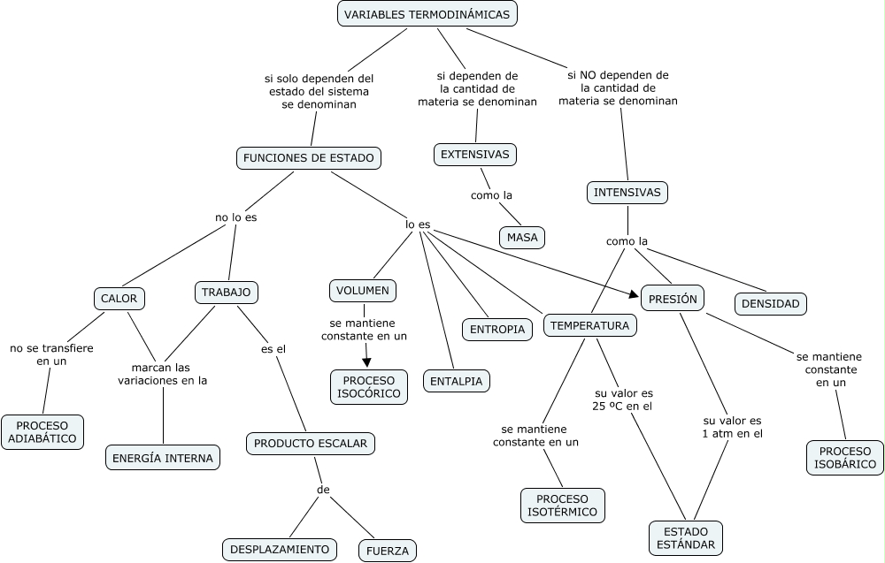 Este Cmap, tiene información relacionada con: Variables termodinamicas, TRABAJO es el PRODUCTO ESCALAR, VARIABLES TERMODIN�MICAS si solo dependen del estado del sistema se denominan FUNCIONES DE ESTADO, PRODUCTO ESCALAR de DESPLAZAMIENTO, PRESIÓN su valor es 1 atm en el ESTADO EST�NDAR, TRABAJO marcan las variaciones en la ENERG�A INTERNA, FUNCIONES DE ESTADO lo es VOLUMEN, FUNCIONES DE ESTADO lo es TEMPERATURA, TEMPERATURA se mantiene constante en un PROCESO ISOTÉRMICO, EXTENSIVAS como la MASA, VOLUMEN se mantiene constante en un PROCESO ISOCÓRICO, FUNCIONES DE ESTADO lo es ENTROPIA, INTENSIVAS como la TEMPERATURA, CALOR marcan las variaciones en la ENERG�A INTERNA, PRODUCTO ESCALAR de FUERZA, VARIABLES TERMODIN�MICAS si NO dependen de la cantidad de materia se denominan INTENSIVAS, CALOR no se transfiere en un PROCESO ADIAB�TICO, INTENSIVAS como la PRESIÓN, INTENSIVAS como la DENSIDAD, FUNCIONES DE ESTADO lo es PRESIÓN, FUNCIONES DE ESTADO lo es ENTALPIA